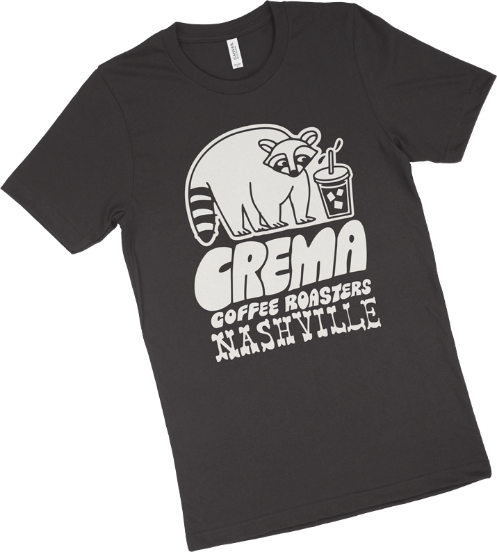 Crema Coffee Roasters has been steadily building a t-shirt line that feels just as intentional as their coffee. Working with designer Matt Lehman, they’ve gone beyond a simple logo tee (though the classics remain a favorite) to create playful, illustrated designs that bring the brand’s personality to life- like a raccoon sipping iced coffee! New shirts continue to roll out, keeping the collection fresh and ever-growing, with each release balancing timeless branding and imaginative storytelling.