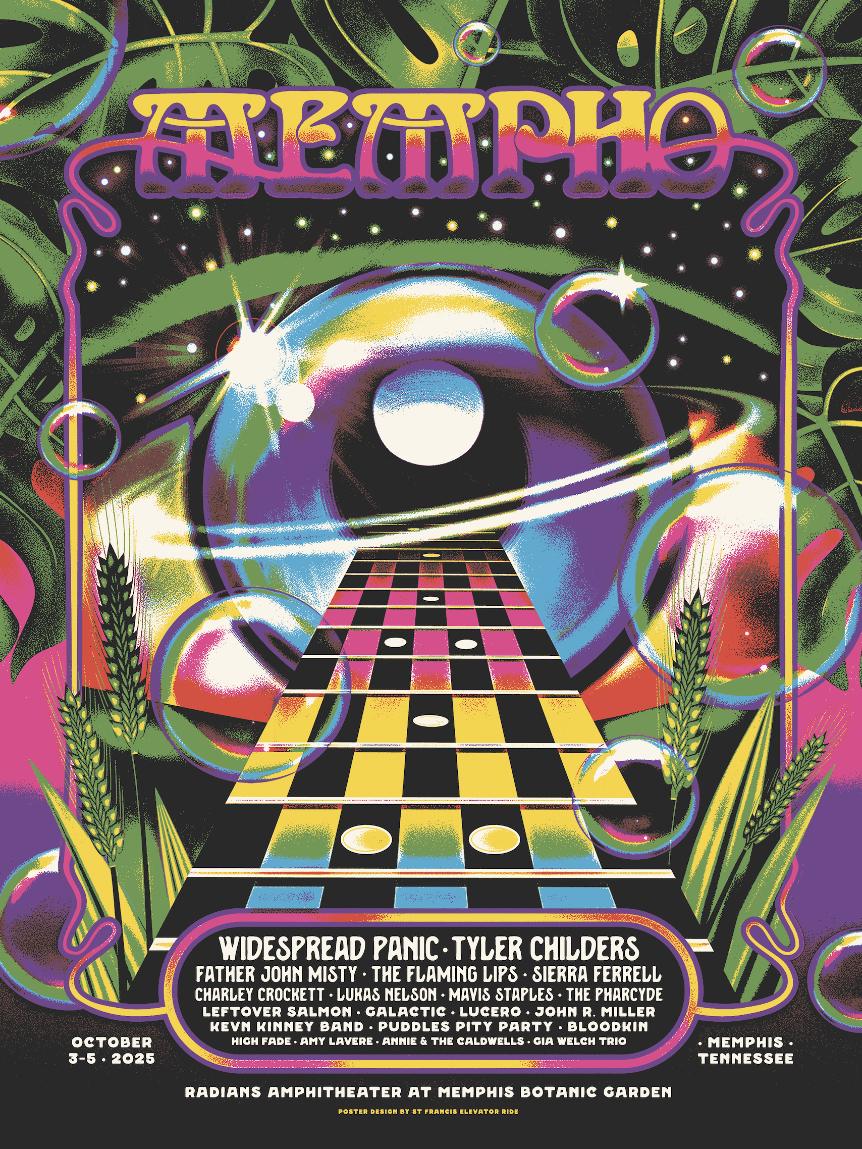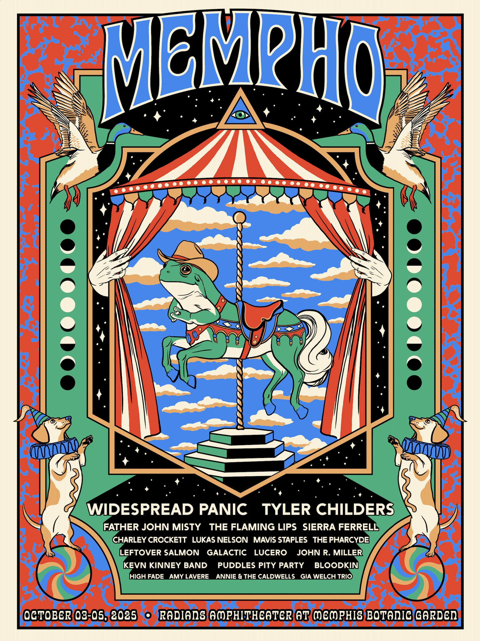 Mempho Fest is known for bold, collage-driven visuals that feel bright, loud, and full of energy. The posters are created by artist Josh Breeden of St. Francis Elevator Ride, whose distinctive style has become a defining part of the festivals’ visual identity. They have also added guest artists in recent years bring a fun new mix of style.